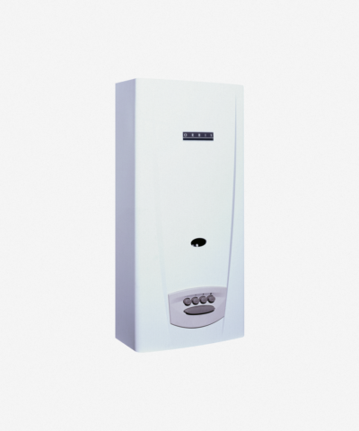 Calefón tiraje natural de 14 l/min de tamaño tradicional. Comando a botonera. Encendido electrónico.